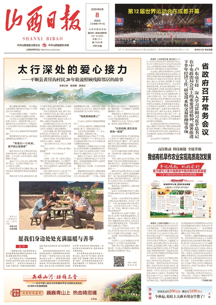 图为2025年8月8日山西日报头版头条刊发的《太行深处的爱心接力——平顺县黄崖沟村民20年轮流照顾残障邻居的故事》报道。
