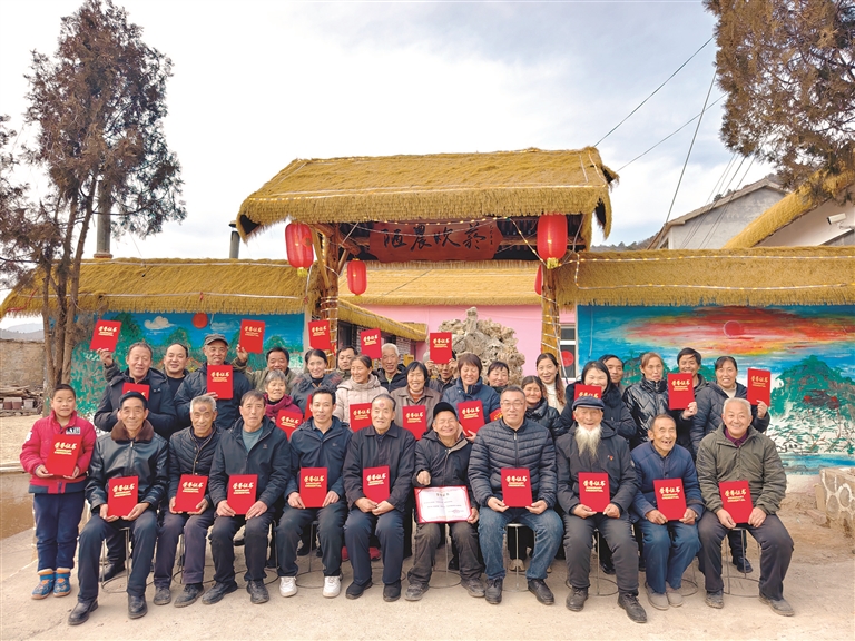 村民围着海松,拿着荣誉证书,一起拍新春“全家福”。
