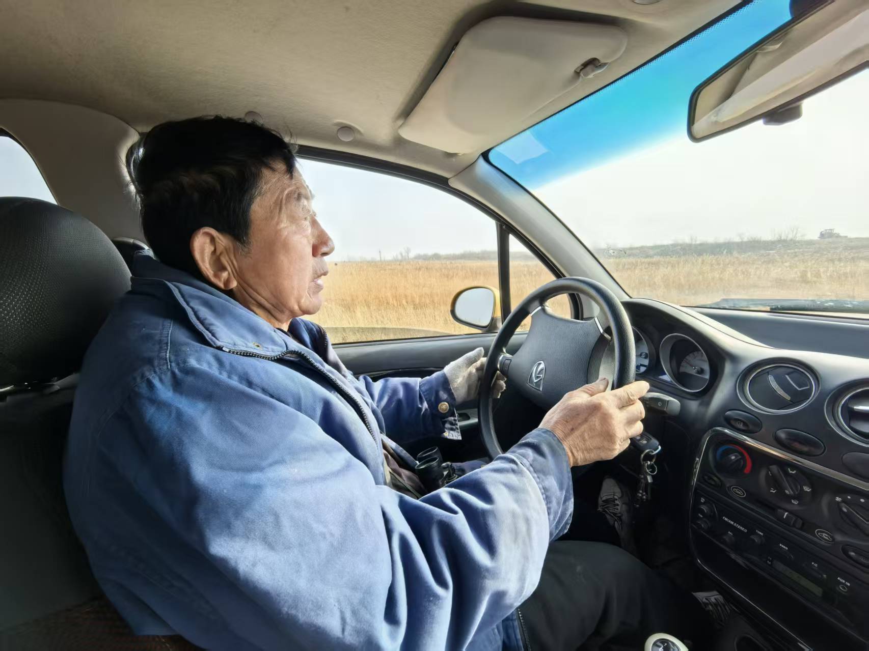 盐湖野生动物巡护员马红义牵着小狗“小黄”,挎上望远镜,带记者坐进颇有年代感的金黄色小汽车,准时踏上巡护路。“平时我都是走路或者骑电动,今天咱们去离盐湖最近的地方。”他笑着对记者说。