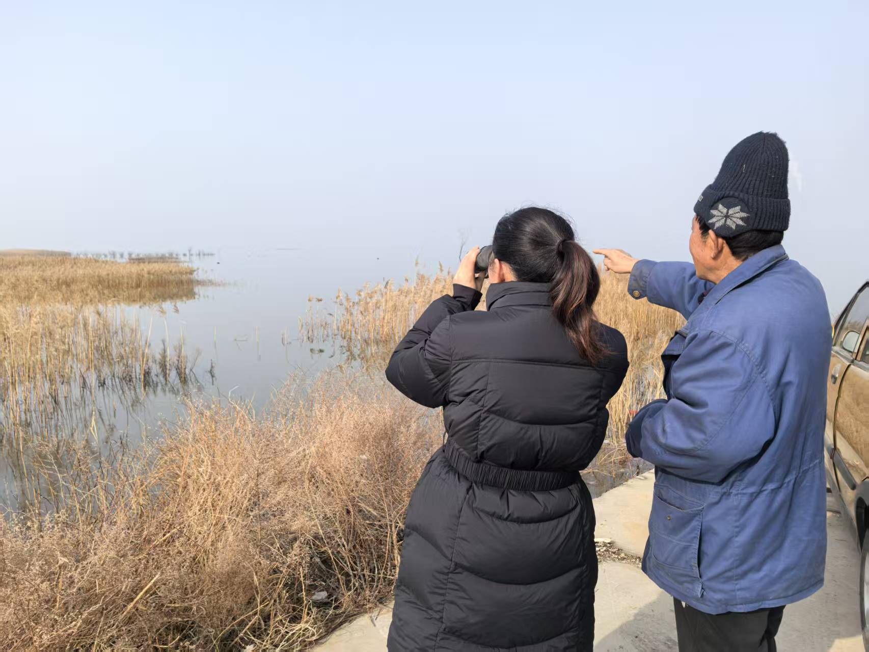 巡湖途中,两名市民专程来观鸟,询问能否见到火烈鸟。马红义热情迎上前,指着湖面讲解:“往年它们就在这片活动,2018年从这儿飞走的。”说着递过望远镜,并亲切叮嘱:爱鸟更要护鸟。