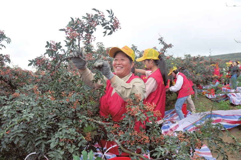 芮城县风陵渡镇农民在采收花椒。