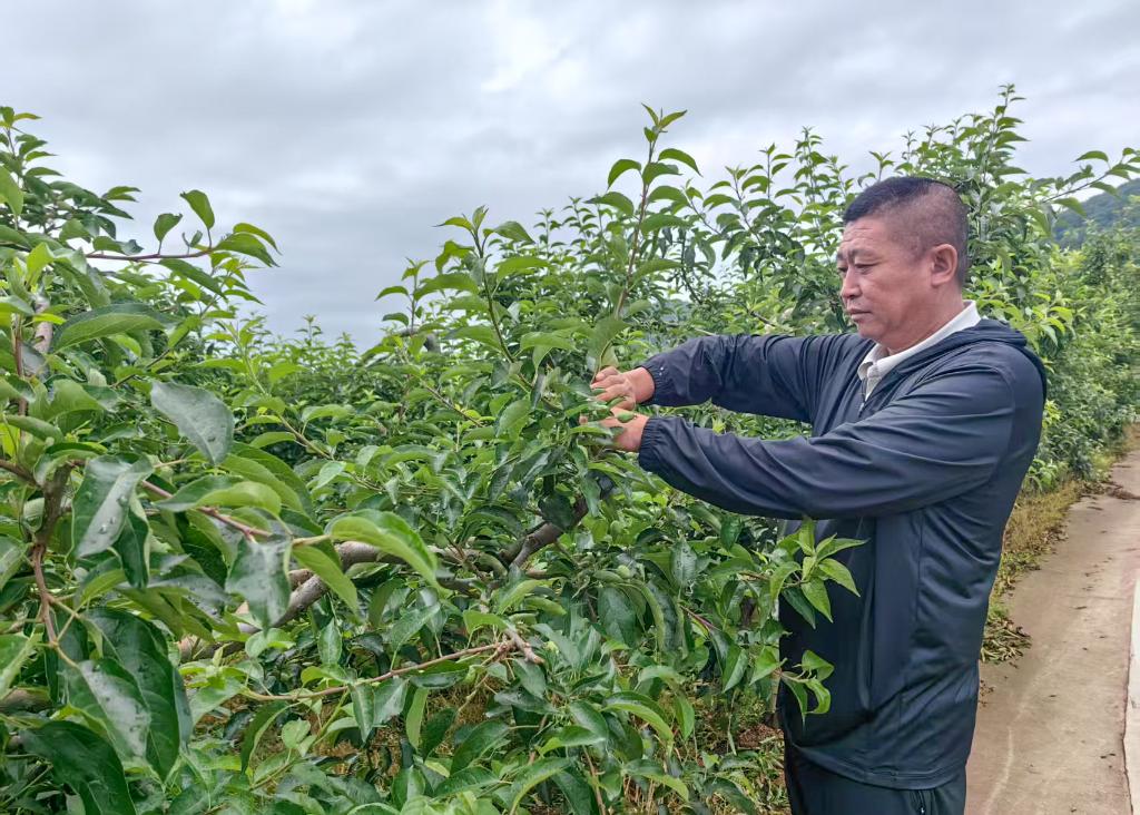 6月20日,北锅盔村党支部书记栾仁生正在果园里疏枝。新华社记者王帆 摄