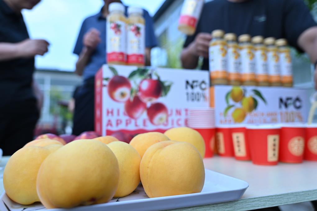 这是7月4日拍摄的河北光存生物科技有限公司种植的黄桃和NFC果汁产品。新华社记者 李鑫 摄