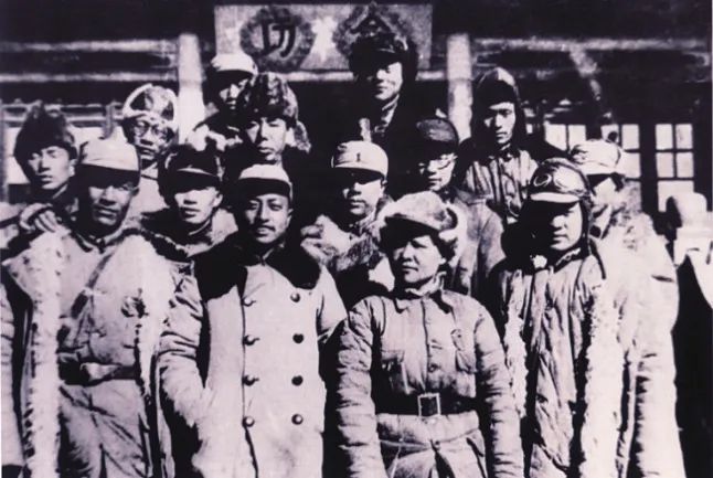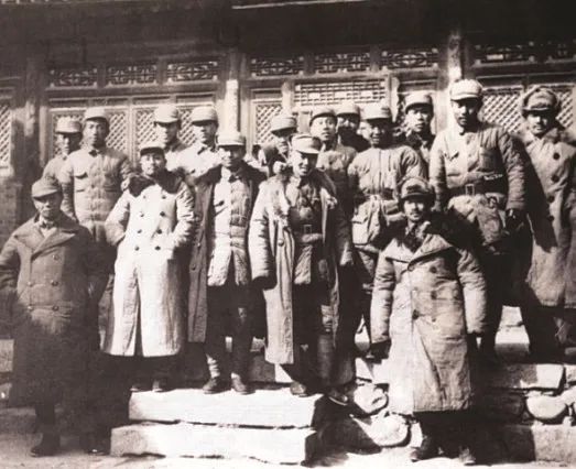 晋西北新军领导人续范亭(三排左二)等与归国华侨抗日女英雄李林(前排右二)在反顽斗争祝捷大会上。