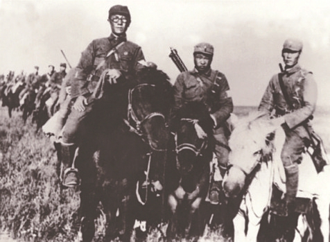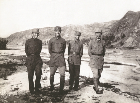 图4 1938年6月下旬,根据中共中央、中央军委和毛泽东关于建立大青山抗日游击根据地的指示,八路军第一二〇师决定抽调部队组成大青山支队,开辟大青山抗日游击根据地。图为1938年7月,大青山支队司令员兼政委李井泉(左一)等率部挺进大青山。