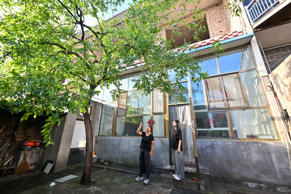 山西省吕梁市兴县蔡家崖村村民牛雨梅(左)和女儿在自家小院内查看枣树长势(6月30日摄)。新华社记者 李鑫 摄