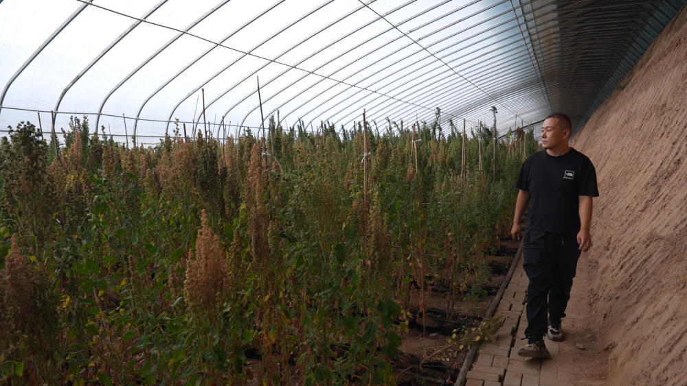 在山西省忻州市静乐县的中国藜麦之乡产业园内,农艺师郝志峰在日光温室育种试验大棚内查看藜麦长势(7月1日摄)。新华社记者 李鑫 摄
