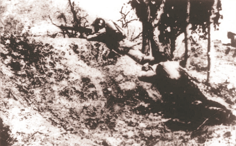 八路军第一二九师三八五旅苦战六昼夜,同日军展开狮脑山争夺战。图为坚守狮脑山阵地的八路军。