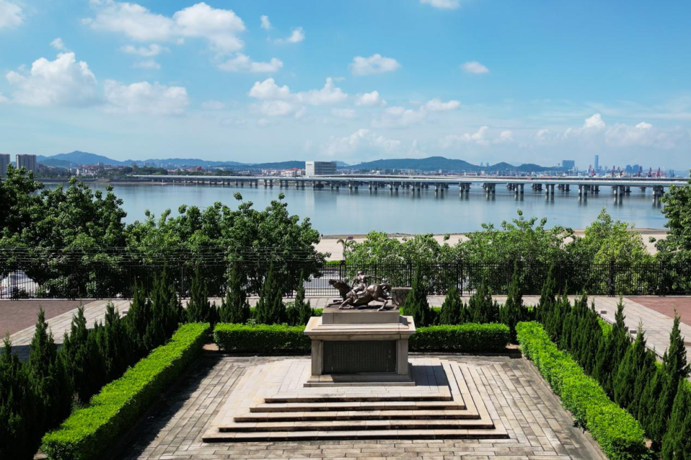 ↑福建省厦门集美中学李林园内,面海而立的李林雕像。(无人机照片)钟炜俊 摄