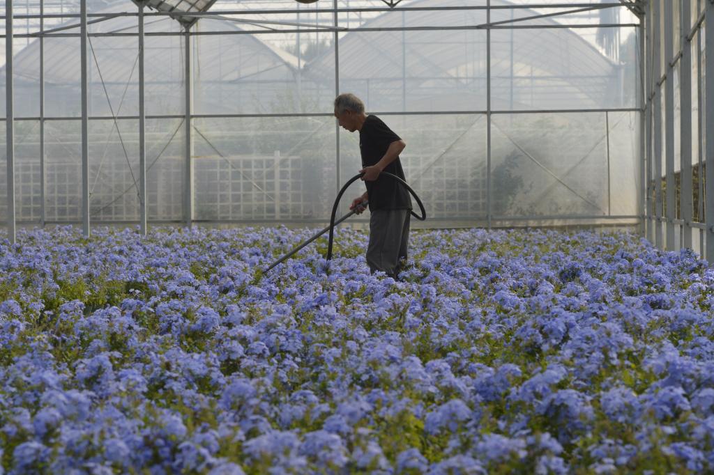 11月2日,位于海宁市盐官镇桃园村的“塔莎的花园”大棚里,员工正在进行花卉养护作业。新华社记者刘力航 摄