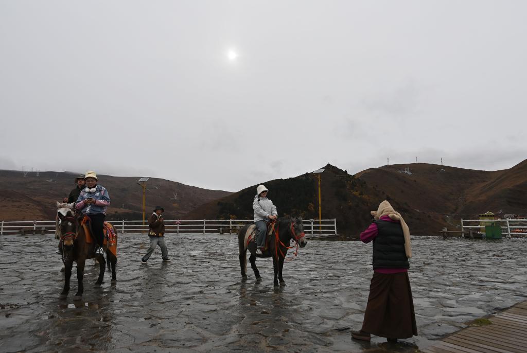 10月31日,游客在四川省甘孜州康定市塔公镇塔公草原景区骑马游玩。新华社记者肖潇 摄