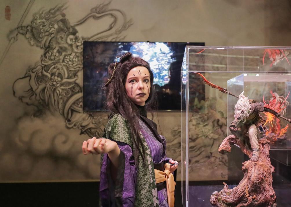 8月20日,在德国科隆,一名《黑神话:悟空》游戏角色扮演者在游戏科学展台与模型合影。(新华社记者 张帆 摄)