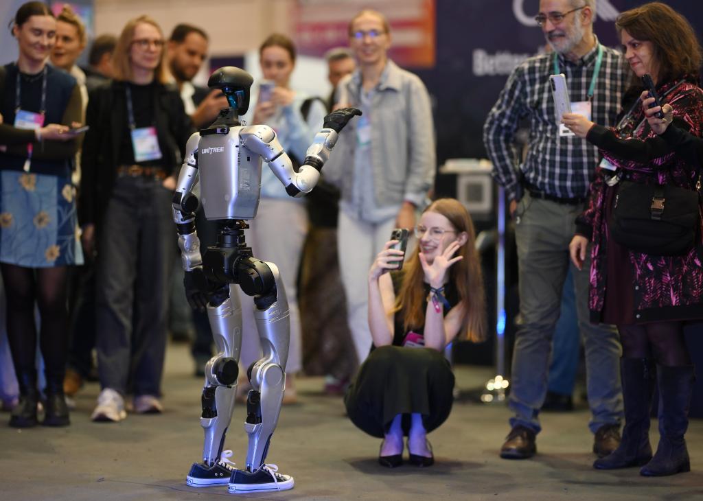 11月12日,在葡萄牙里斯本,中国企业宇树科技的人形机器人和与会者在2025年网络峰会现场互动。