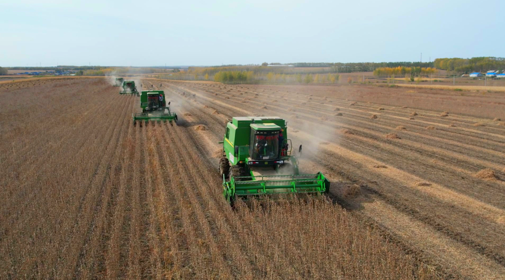 绥棱县克音河乡向荣村托管地块大豆收获现场。(受访者供图)