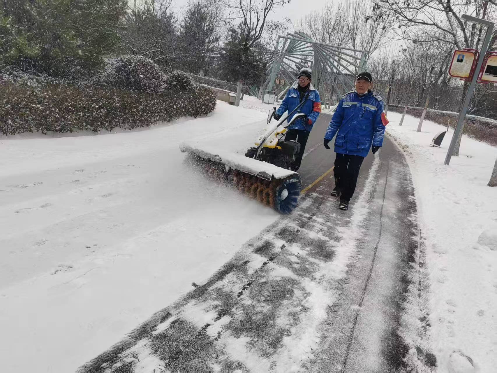 工作中,采取“机械+人工”相结合的作业模式,积极运用手推式扫雪机、肩扛式吹风机等设备配合人工清扫,落实网格化责任制。经过连续奋战,基本实现了“雪下即动、边下边清、雪停路净、绿化无损、游园安全”的既定目标,有效维护了城市园林绿化成果和市民游园安全。
