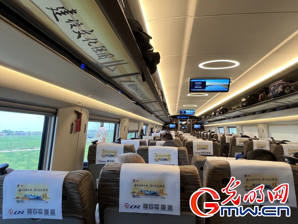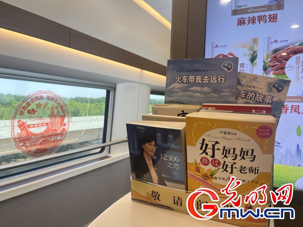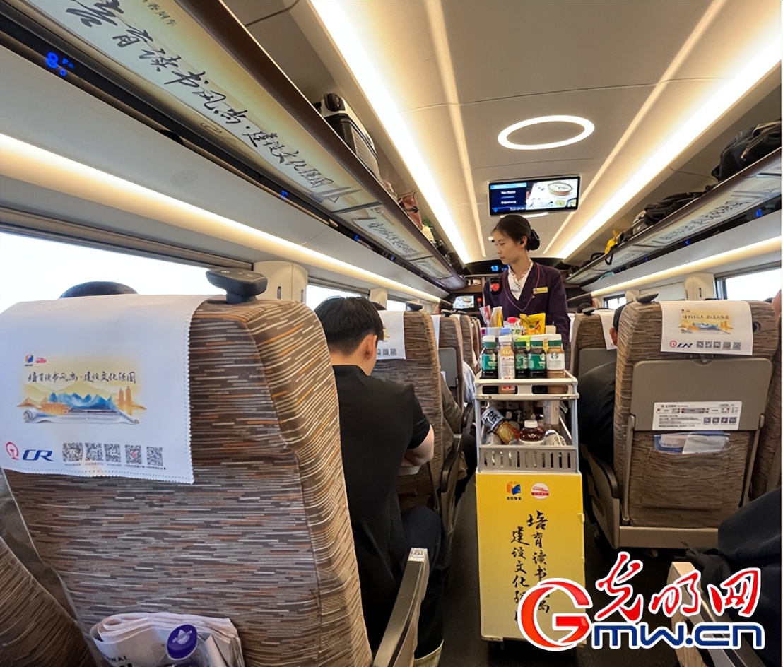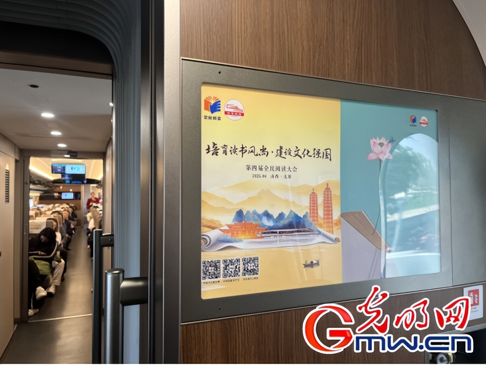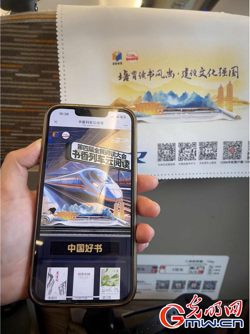 光明网讯(记者张倩)4月23日-25日,第四届全民阅读大会在山西太原举办。据了解,4月20日-26日,往返北京丰台站与太原南站的G61次和G610次、G609次和G618次,往返北京西站与太原站的G605次和G612次、G613次列车被设置为第四届全民阅读大会“书香列车”。图为4月22日,G609次列车上开展“书香铁路·我喜爱的好书”读书分享活动,一名旅客正在进行阅读分享。(列车供图)