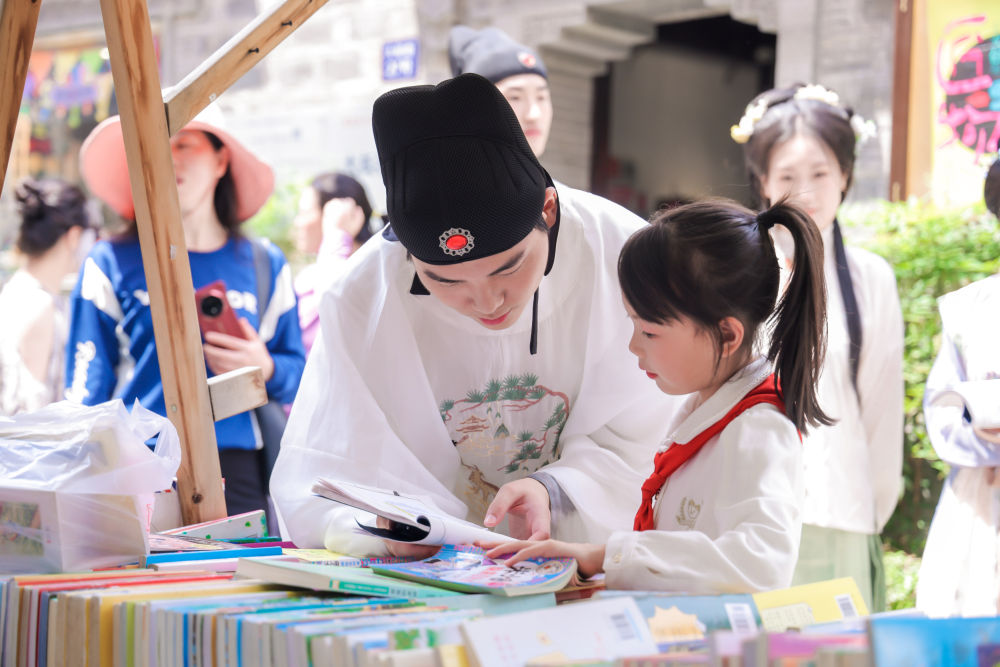 南京金陵旧书市集里,古风装扮NPC(非玩家角色)引导员正在与一位小学生互动。(受访者供图)