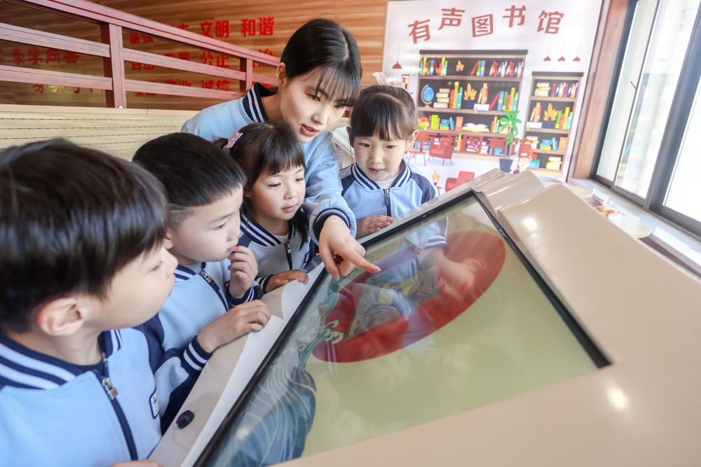 在浙江省湖州市长兴县龙山街道玄坛庙农家书屋,龙山街道幼儿园的孩子们在体验电子有声阅读。(2024年4月23日拍摄)新华社发(吴拯 摄)