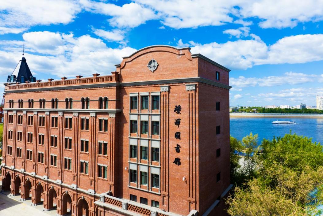 图书馆坐落在中俄边境线上,与对岸俄罗斯布拉戈维申斯克市隔江而望。外观设计融合欧陆风格,将历史文化注入其中,大楼主体采用三段式立面设计,像一本本书整齐地摆放在书架上,寓意“城市的书架”。图书馆藏书10万册,包含俄文藏书专区,成为“中俄双子城”的一张文化名片。