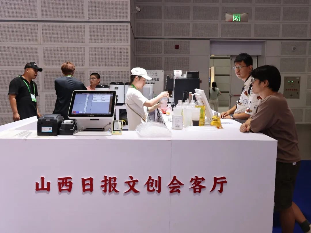 这边带着墨香的头版“报纸”刚刚出炉,旁边的文创饮品区飘来的阵阵茶香与果香就吸引了小朋友的注意,这里俨然已经成为展厅的“社交会客厅”,以《山西日报》品牌文化为内核,创意推出的系列主题特调茶饮,每一杯都是一份“可品尝的文化符号”。