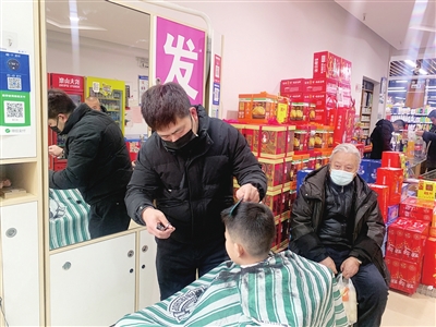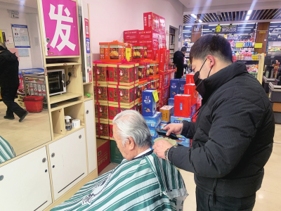 腊月廿二,年味儿愈发浓郁。位于水西关街74号的客都超市里摆满了春联、福字和各色年货,紧邻年货摊位的是“快剪理发”店。