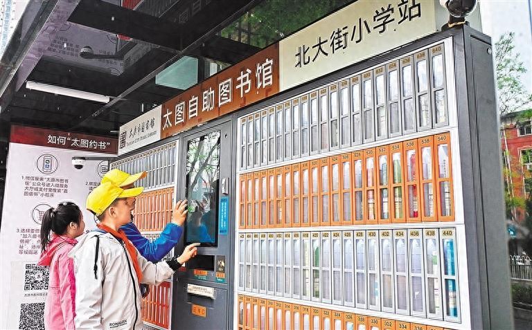 4月18日,小学生在山西太原太图自助图书馆借书。分布在6城区的68座自助图书馆,以便捷、智能的服务,为太原市民开启阅读新体验。郭苑甫摄(中经视觉)