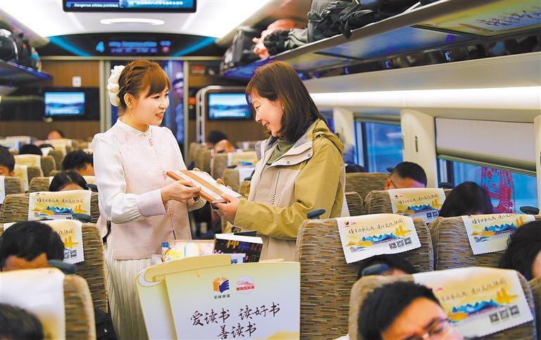 4月21日,D1152次列车工作人员利用流动小车送书到车厢。为服务第四届全民阅读大会,国铁太原局在管内列车餐吧台增设“读书角”,为旅客提供图书借阅服务。张 炯摄(中经视觉)